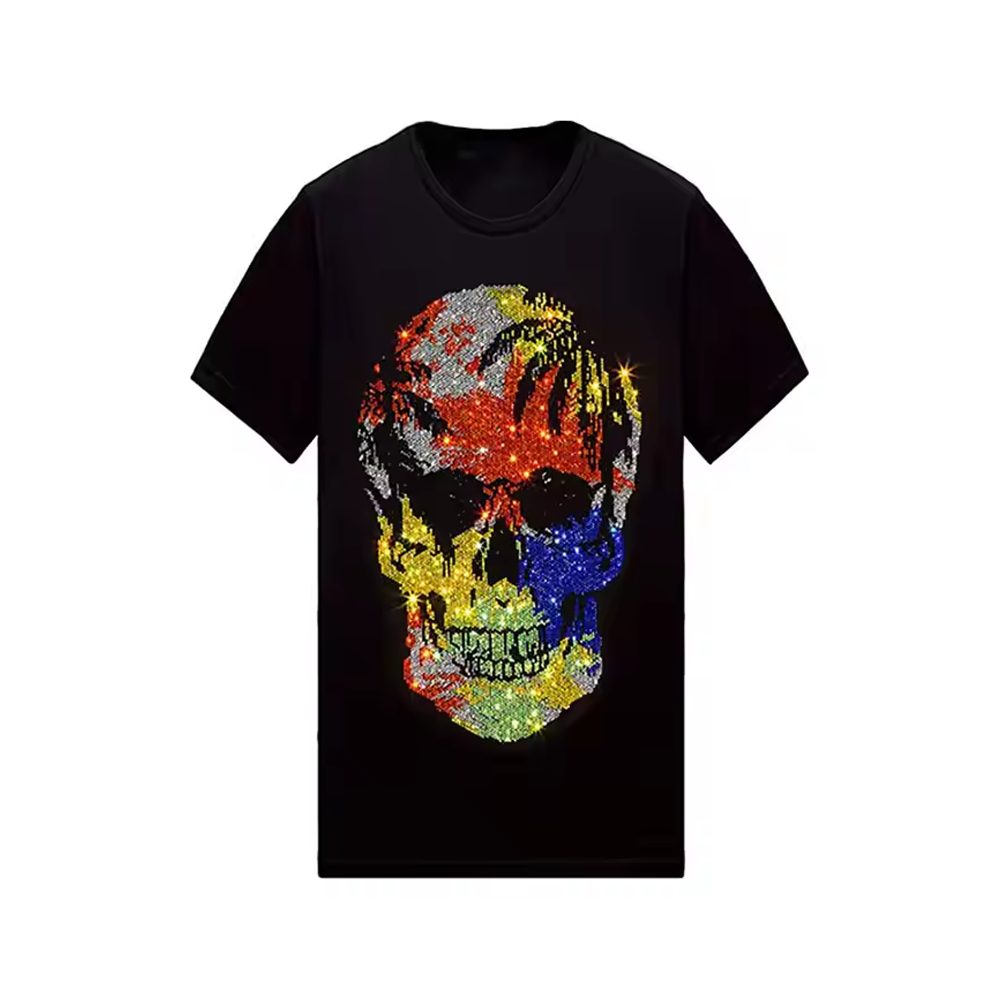 Designed for durability and visual appeal, this rhinestone heat transfer design is perfect for T-shirts, jackets, hoodies, bags, and fashion accessories. The multicolor rhinestones create a dazzling effect under light, making the skull graphic look lively, stylish, and attention-grabbing from every angle.